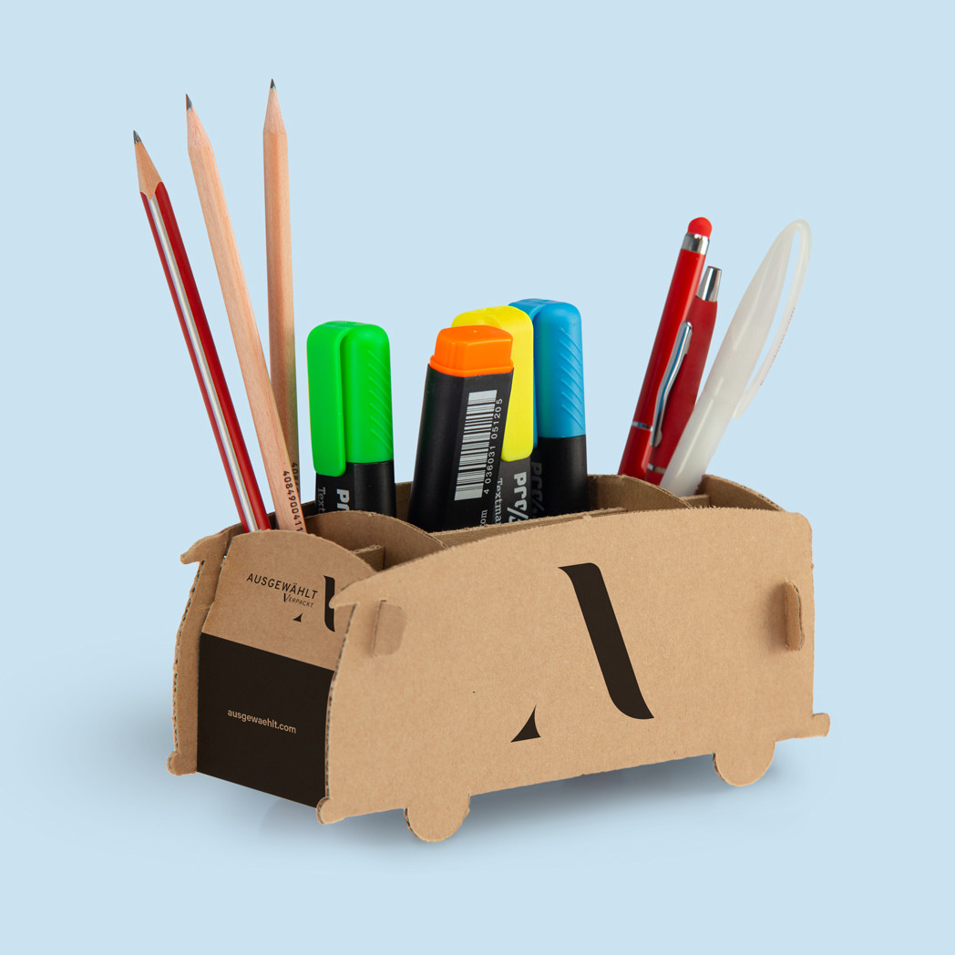Unser Stiftehalter ersetzt – wie alle unsere packenden Ideen fürs Büro – Produkte, die üblicherweise aus Plastik gefertigt sind, durch stabile, recycelbare Pappe. Ebenfalls typisch AUSGEWÄHLT VERPACKT: Auch der Stiftehalter lässt sich ganz nach Ihren Wünschen bedrucken. Sie entscheiden wie, womit und für wen – wir gestalten Ihren Stiftehalter nach Ihren Vorstellungen. Los geht’s!