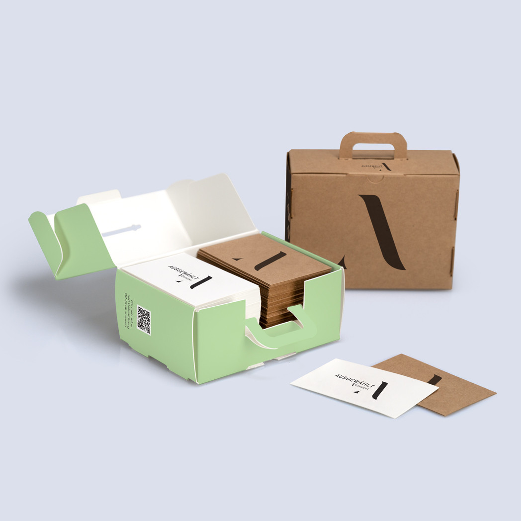 In drei Materialien erhältlich: Das hellweiße Budget-Material 400 g Chromosulfatkarton für Preisbewusste. Das stabile Exklusiv-Material 450 g Chromosulfatkarton mit samtiger Oberfläche. Das nachhaltige Umwelt-Material 330 g Kraftkarton braun, das zu 100 % ungebleicht ist.