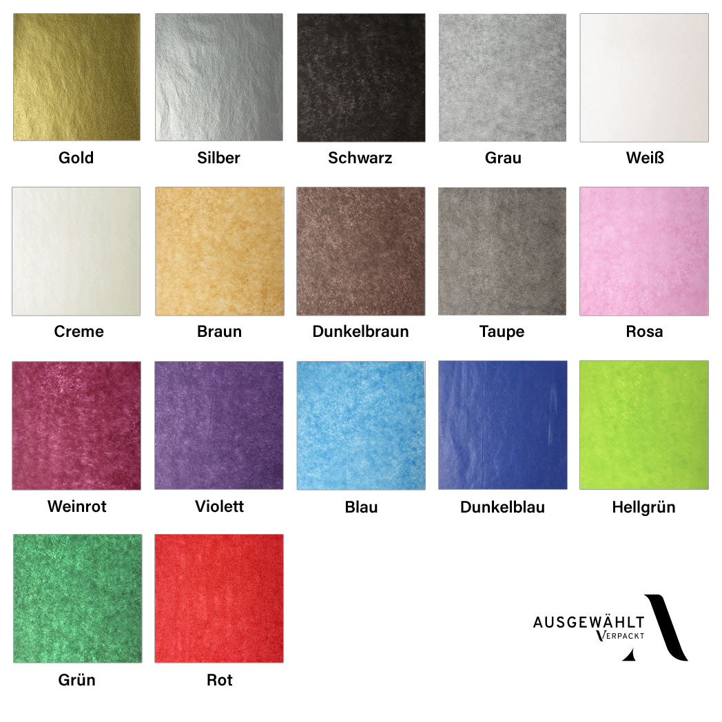Das extra weiche Seidenpapier wird aus nachwachsenden Rohstoffen hergestellt – ohne Chlor oder Säure. Es färbt nicht ab und lässt sich zu 100 % über Altpapier entsorgen.