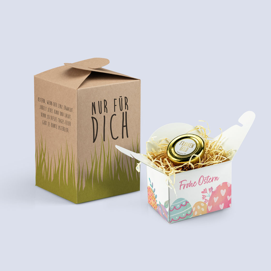 *Der Rabattcode ist gültig bis zum 17.04.2022 auf die Produkte Osterkorb, Schleifenverpackung Ostern, Geschenktasche Ostern und Österliche Kissenschachtel. Keine Barauszahlung möglich, nicht kombinierbar mit anderen Rabattaktionen. Pro Bestellung ist ein Code einlösbar.