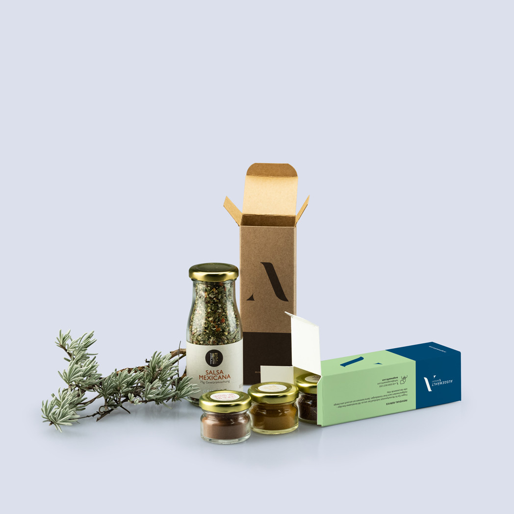 Bei AUSGEWÄHLT VERPACKT können Sie zwischen fünf verschiedenen Formaten für Ihre Faltschachteln wählen. Von quadratisch bis rechteckig, von schmal bis voluminös. Welche Form passt am besten zu Ihrem Anlass und Produkt? Während große Produkte auch große Verpackungen benötigen, müssen kleine Produkte nicht zwangsläufig in kleinen Faltschachteln verpackt werden. Wollen Sie dem Produkt zum Beispiel weitere Beilagen wie Anleitungen, Produktkataloge etc. anfügen, sollten Sie das bereits bei der Bestellung der Boxen aus Karton bedenken. So kann sich auch für kleine Produkte eine etwas größere Verpackung lohnen. Eventuelle Hohlräume können Sie einfach mit Füllmaterial stopfen.