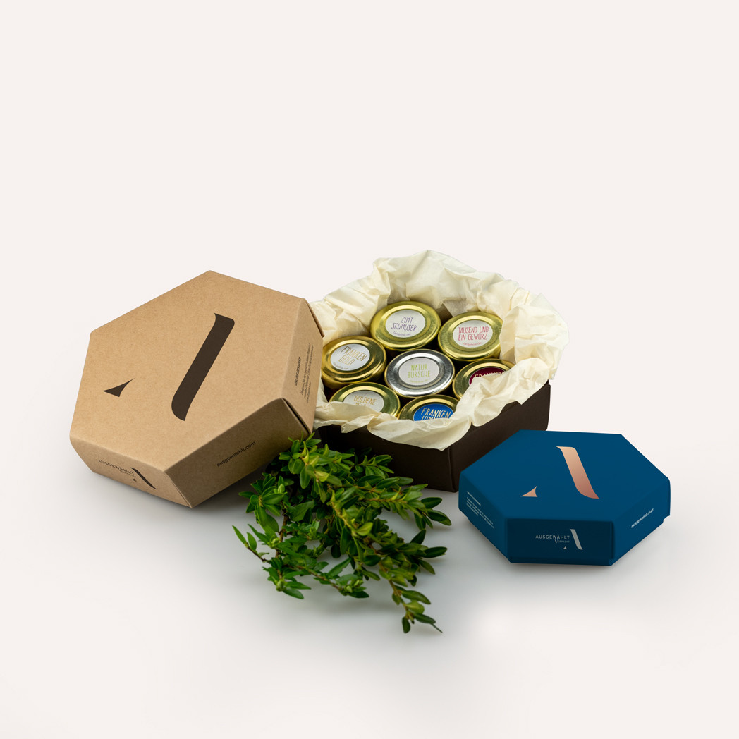 Alle Hexagon-Schachteln werden nach Ihren Vorgaben bedruckt. Mit unserem Online-Designer können Sie bei AUSGEWÄHLT Ihre sechseckigen Stülpschachteln kinderleicht nach eigenen Vorstellungen selbst gestalten. Mit Klick auf „Online gestalten“ unterhalb des Produktbildes gelangen Sie zu unserem intuitiven Gestaltungs-Konfigurator. Fügen Sie mit wenigen Klicks Bilder, Ornamente oder Texte hinzu. Dank 3D-Vorschau können Sie Ihr Design jederzeit überprüfen und anpassen, bis Sie voll und ganz zufrieden sind. Haben Sie bereits ein Design für die Hexagon-Schachteln vorliegen? Selbstverständlich können Sie dieses auch als PDF hochladen und damit Ihre Verpackungen bedrucken lassen. Zuletzt müssen Sie nur noch die gewünschte Auflage einstellen und den Anweisungen folgen, um den Bestellprozess abzuschließen. Daraufhin bedrucken wir Ihre Stülpschachteln und senden sie Ihnen im individuellen Design und in der gewünschten Anzahl innerhalb von 8 bis 9 Werktagen zu.