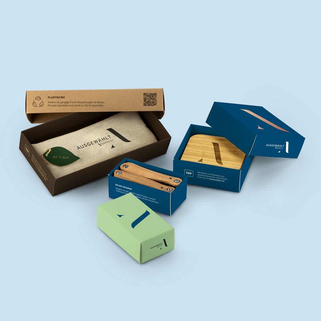 In drei Materialien erhältlich: Das hellweiße Budget-Material 400 g Chromosulfatkarton für Preisbewusste. Das stabile Exklusiv-Material 450 g Chromosulfatkarton mit samtiger Oberfläche. Das nachhaltige Umwelt-Material 330 g Kraftkarton braun, das zu 100 % aus Recyclingfasern besteht.