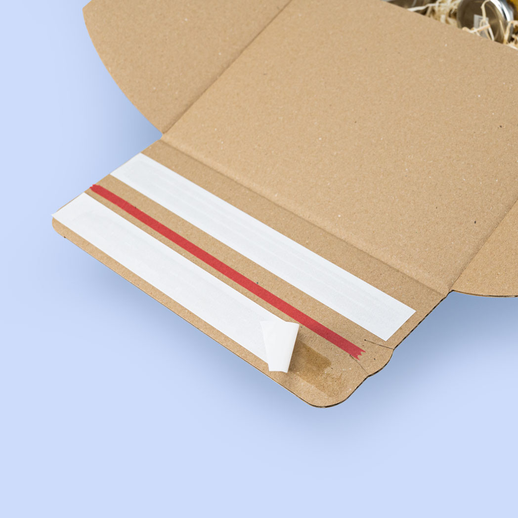 Für den Versand kleben Sie das Paket einfach mithilfe des ersten Klebestreifens sicher zu. Der dafür vorgesehene Verschlussstreifen entwickelt optimale Klebekraft durch festes Andrücken. Der Kunde öffnet das Paket zuhause mithilfe des Aufreißfadens. Möchte er sein Paket anschließend zurückschicken, nutzt er dafür den zweiten Klebeverschluss.