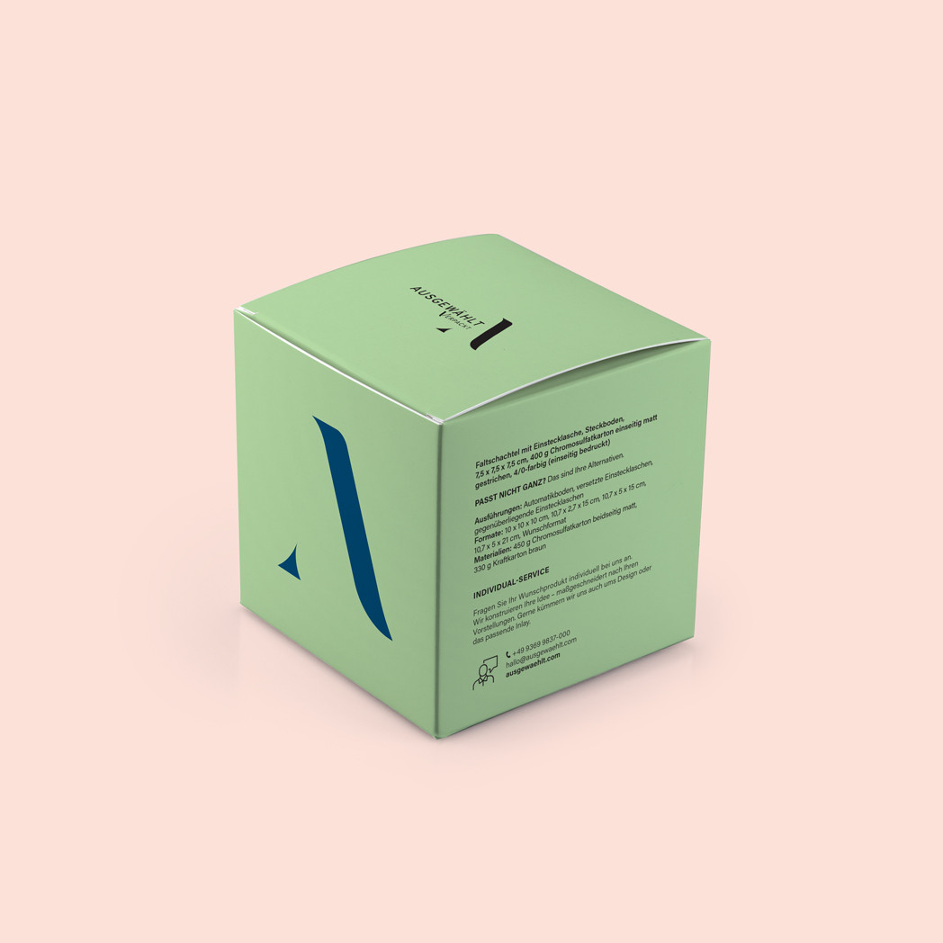 Bei AUSGEWÄHLT VERPACKT können Sie zwischen verschiedenen Formaten für Ihre Faltschachteln wählen. Von quadratisch bis rechteckig, von schmal bis voluminös. Welche Form passt am besten zu Ihrem Anlass und Produkt? Während große Produkte auch große Verpackungen benötigen, müssen kleine Produkte nicht zwangsläufig in kleinen Faltschachteln verpackt werden. Wollen Sie dem Produkt zum Beispiel weitere Beilagen wie Anleitungen, Produktkataloge etc. anfügen, sollten Sie das bereits bei der Bestellung der Boxen aus Karton bedenken. So kann sich auch für kleine Produkte eine etwas größere Verpackung lohnen. Eventuelle Hohlräume können Sie einfach mit Füllmaterial stopfen.